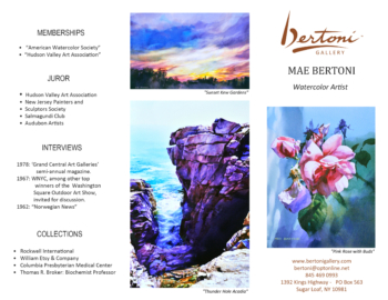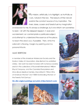 Mae Bertoni is an award-winning artist, holding several awards from the Washington Square Outdoor Art Exhibit, the Long Beach Art Association, the Catherine Lorillard Wolf Art Club, and the Hamiltonian Art Association. She is listed in “Who’s Who of American Women” and “2,000 Outstanding Women of the Twenty-First Century” and has been a juror for several art associations, including Audobon Artists, the Sculptors Society, and the Hudson Valley Art Association.
